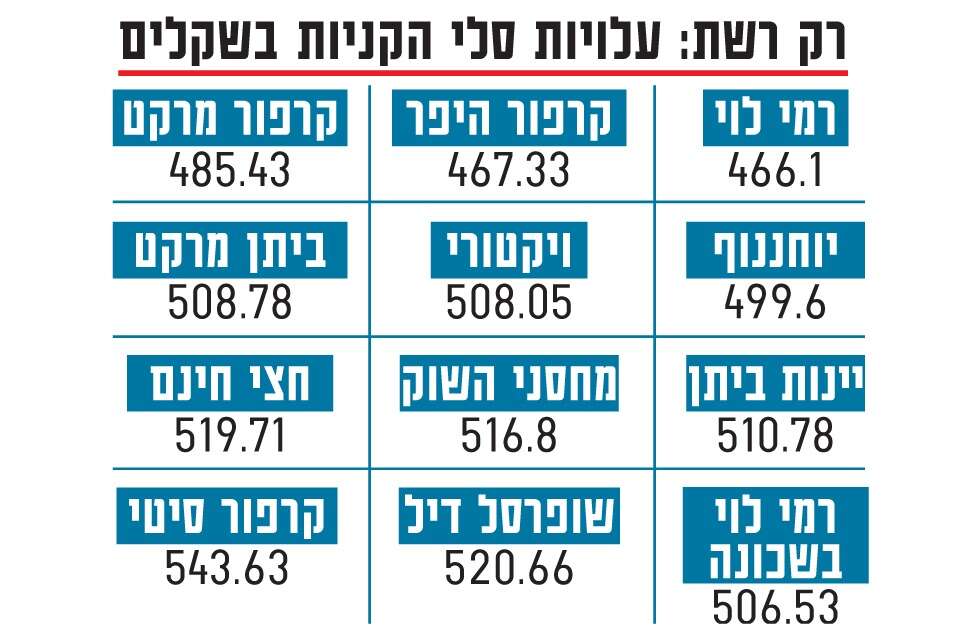 מהסל עולה כי הרשת הזולה ביותר היא רשת הדיסקאונט של רמי לוי, עם סל שעלותו 466.1 שקלים, ואילו הרשת היקרה ביותר מבין הרשתות שנבדקו היא הרשת השכונתית של טיב טעם, טיב טעם בסיטי, עם סל שמחירו 641.3 שקלים. הפער ביניהן הוא 175.2 שקלים, קרי 37.59%.