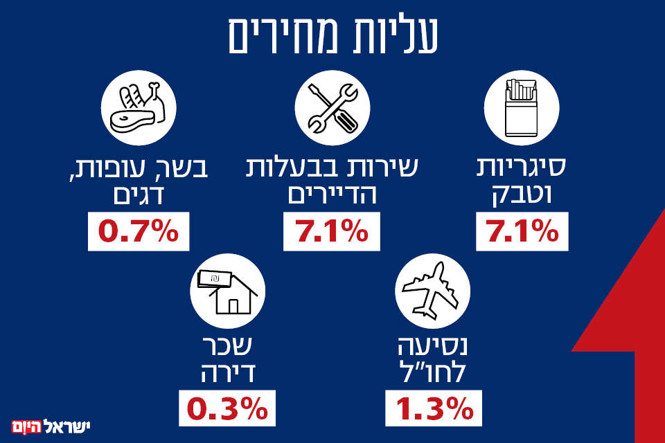 עליות מחירים בולטות נרשמו בסעיפים הבאים: שונות, שעלה ב-3.5%, הלבשה והנעלה, שעלה ב-2.0%, תרבות ובידו,ר שעלה ב-1.5%, דיור, שעלה ב-0.6%, בריאות, שעלה ב-0.5% ותחבורה, שעלה ב-0.4%. ירידת מחירים בולטת נרשמה בסעיף הבא: ירקות ופירות טריים - שירדה ב-3.0%.