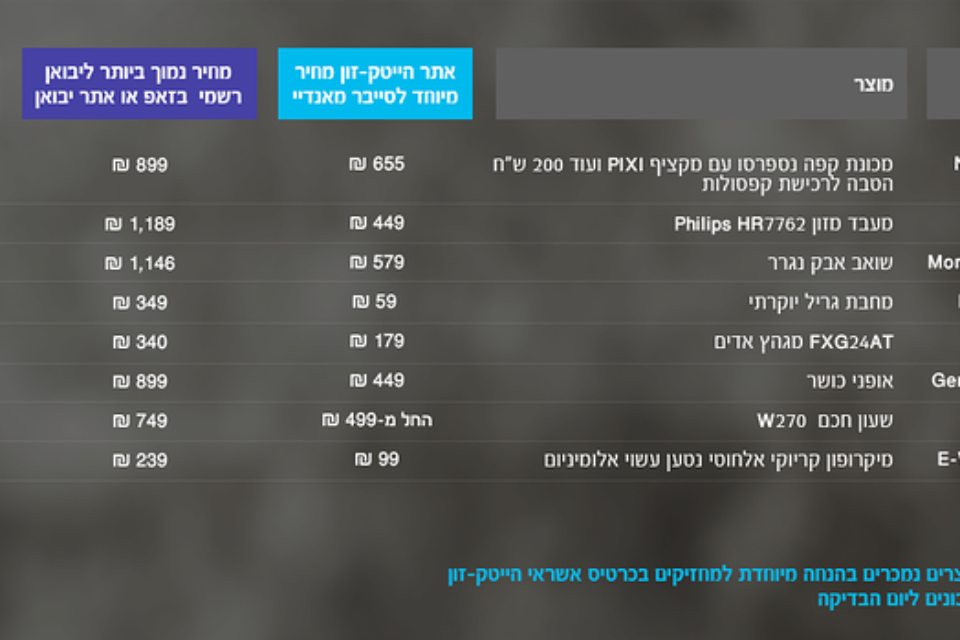 מאחר שבשנים האחרונות העיתונים התחילו להשוות גם מחירים של מועדוני צרכנות (כגון הופעות חנוכה וכיוב') שמהם עולה כי הם מובילים את ההנחות בשוק, חשבנו שהדרך הנכונה ביותר לבדוק האם ההנחות של סייבר מאנדיי אמיתיות באמצעות השוואה בין מחיריהם של מוצרים נבחרים באתר זאפ לאחד ממועדוני הצרכנות הגדולים בישראל – הייטקזון, המאגד כרבע מיליון עובדי היי-טק.
