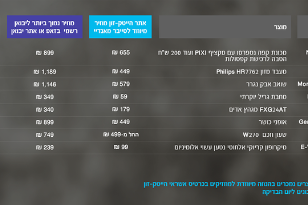 וכך למשל, המחיר הנמוך ביותר באתר זאפ למכונת קפה של חברת NESPRESSO עם מקציף PIXI + 200 ש"ח הטבה לרכישת קפסולות,שמשווק על ידי יבואן רשמי עומד על  899 ש"ח. מנגד, 'בהייטקזון' מוכרים את המוצר בהנחה משמעותית  - 655 ש"ח בלבד.
