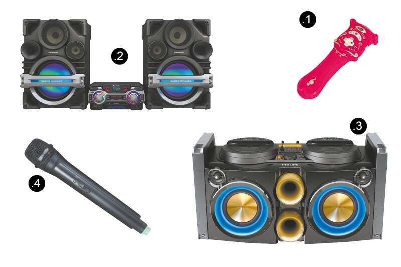 1. מיקרופון נייד, מאתר kidzone, מחיר: 49 ש', 2. מערכת של "פנסוניק", מחיר: 4,490 ש', 3. מערכת של "פיליפס", מחיר: 2,190 ש', 4. מיקרופון נייד מבית "ביקונקט", מחיר: 399 ש' // צילום: אתר "שופיס"