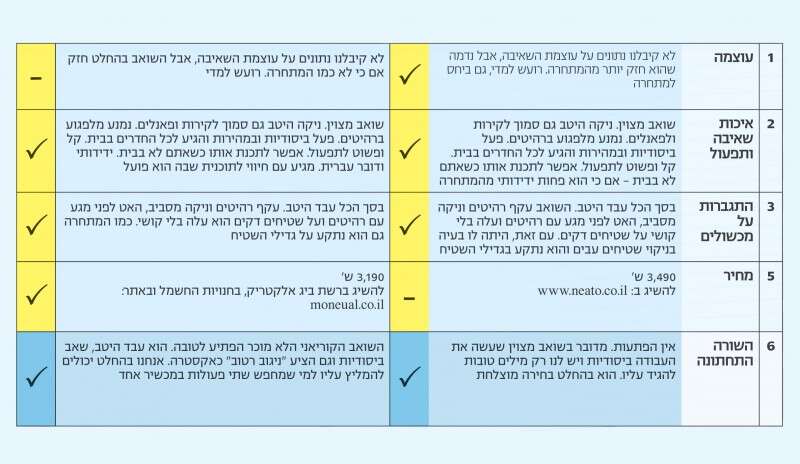 השורה התחתונה: השואב הקוריאני הפתיע לטובה. הוא שאב ביסודיות וגם הציע "ניגוב רטוב", ואנחנו בהחלט יכולים להמליץ עליו לכל מי שמחפש שתי פעולות במכשיר אחד. בנוגע לניטו - מדובר בשואב מצוין שעשה את העבודה ביסודיות. כל בחירה כאן היא בחירה מוצלחת.
