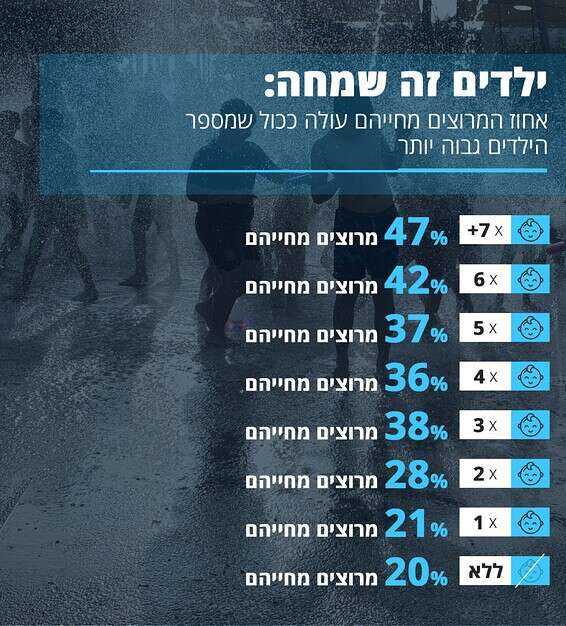 בקרב החרדים, 94% סבורים שעל אישה להקים משפחה עד גיל 24. 52% מהחילונים סבורים שמספר הילדים האידיאלי הוא שלושה. לעומתם, שני שליש מהחרדים מעדיפים משפחה עם שישה ילדים ויותר.