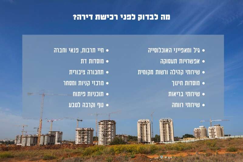 בחירת סוג ואופי היישוב שבו יגור רוכש הדירה, קובעת במידה גדולה את סגנון ואיכות החיים של הרוכש ושל משפחתו. על כן, יש להביא בחשבון פרמטרים חשובים רבים. כצעד ראשון, יש לבחון את הגורמים הסביבתיים לרכישת דירה, כל זאת בהתאם לתקציב הדירה. יש לבחון את עשרת הנקודות הבאות כאשר הראשונה שבהן, היא מהן אפשרויות התעסוקה באזור המבוקש.