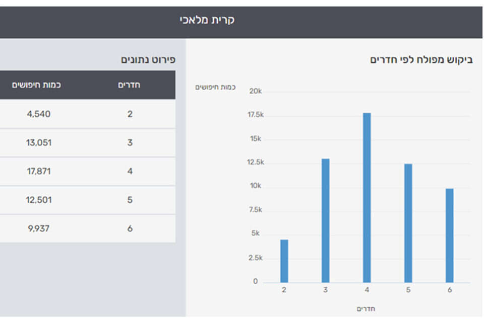התפלגות החיפושים בשנה האחרונה על פי סוגי הדירות, מתוך כלל החיפושים בעיר: 2 חדרים – 7.8%, 3 חדרים – 22.5%, 4 חדרים – 30.9%, 5 חדרים – 21.6%, 6 חדרים – 17.2%.