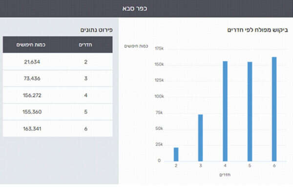 התפלגות החיפושים על פי סוגי הדירות: 2 חדרים – 3.8%, 3 חדרים – 12.9%, 4 חדרים – 27.4%, 5 חדרים – 27.3%, 6 חדרים – 28.7%.