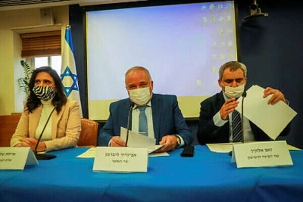 שקד, ליברמן ואלקין במסיבת העיתונאים. "המטרה לא להוריד את המחירים - אלא לבלום את העלייה" | צילום: אורן בן חקון