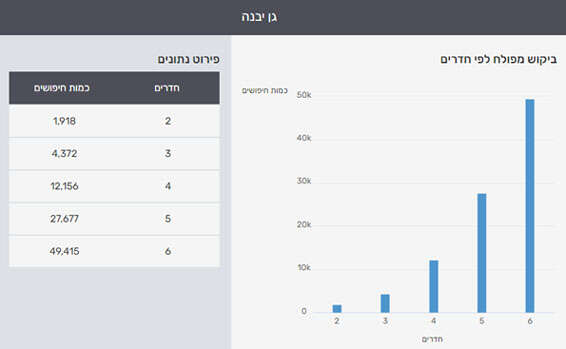 התפלגות החיפושים בשנה האחרונה על פי סוגי הדירות, מתוך כלל החיפושים: 2 חדרים – 2%, 3 חדרים – 4.6%, 4 חדרים – 12.7%, 5 חדרים – 29%, 6 חדרים – 51.7%.