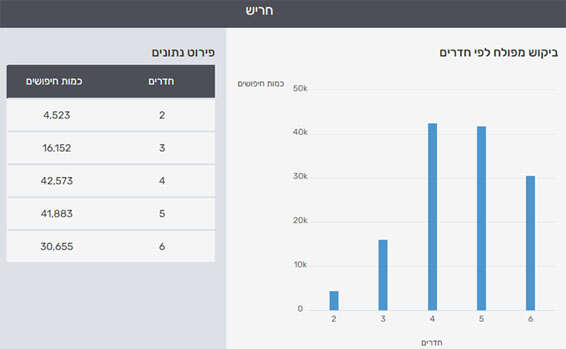 התפלגות החיפושים בשנה האחרונה על פי סוגי הדירות, מתוך כלל החיפושים: 2 חדרים – 3.3%, 3 חדרים – 11.9%, 4 חדרים – 31.4%, 5 חדרים – 30.8%, 6 חדרים – 22.6%.