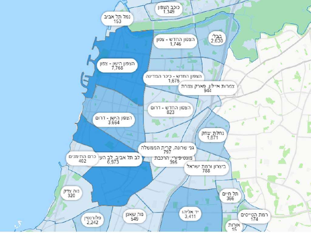 במפה ניתן לראות את כמות החיפושים החודשיים בשכונות המוצגות