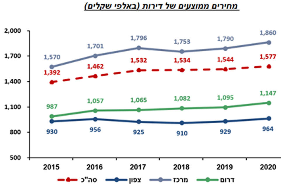 המחיר הממוצע של דירה זינק מאז סוף 2011 ועד היום בכ-42%. בחלק מהערים והמחוזות הזינוק מגיע ל-50% ויותר. מחיר דירה ממוצעת כיום עומד לפי הלמ"ס על 1.577 מיליון שקל, לעומת 1.109 מיליון שקל ב-2011.