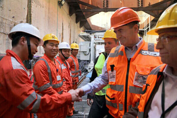 פועלים סיניים עם שר התחבורה לשעבר ישראל כץ (ארכיון). למצולמים אין קשר לכתבה | צילום: גדעון מרקוביץ'