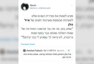 "מציע לשנות את ספירת השנים שלנו למערכת מבוססת מערכת יחסים של אייל גולן", נאמר בהתחכמות נוספת. "'שמע בוס, אני פה עוד מהשנה האחרונה של שנות רוסלנה ואנחנו כבר בסוף שנות גרינברג. לא נראה לך שמגיע לי קידום?'.