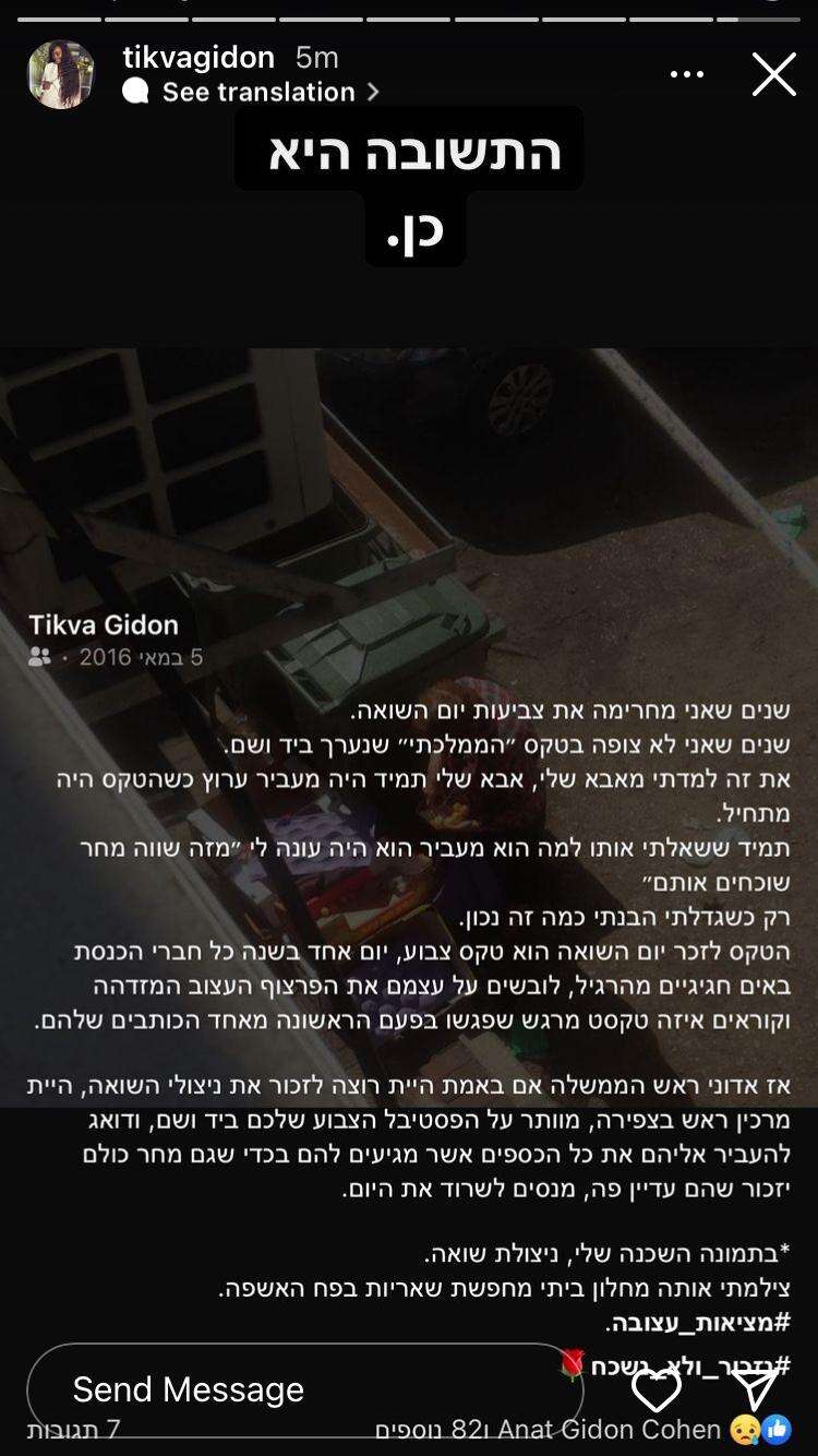 "שנים שאני מחרימה את צביעות יום השואה", פתחה גדעון את דבריה בכותרת מעוררת אי נוחות. "שנים שאני לא צופה בטקס 'הממלכתי' שנערך ב'יד ושם'", שיתפה. "את זה למדתי מאבא שלי, שתמיד היה מעביר ערוץ כשהטקס היה מתחיל. תמיד שאלתי אותו למה הוא מעביר לי, 'מה זה שווה? מחר שוכחים אותם'", השיב לה אביה. "רק כשגדלתי הבנתי כמה זה נכון. הטקס לזכר יום השואה הוא טקס צבוע. יום אחד בשנה כל חברי הכנסת באים חגיגיים מהרגיל, לובשים על עצמם את הפרצוף העצוב והמזדהה, וקוראים איזה טקסט מרגש שפגשו בפעם הראשונה מאחד הכותבים שלהם", האשימה.