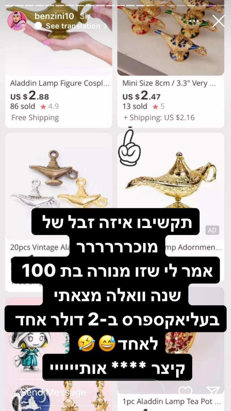 זמן קצר לאחר מכן, בסטורי נוסף, זיני כבר נשמע אחרת לגמרי. "תקשיבו איזה זבל של מוכר. אמר לי שזו מנורה בת 100 שנה. וואלה, מצאתי באלי אקספרס בשני דולר אחת לאחת. קיצר, **** אותי", כתב על רקע צילום מסך של עמוד רכישת המנורות מאתר הקניות הפופולארי.