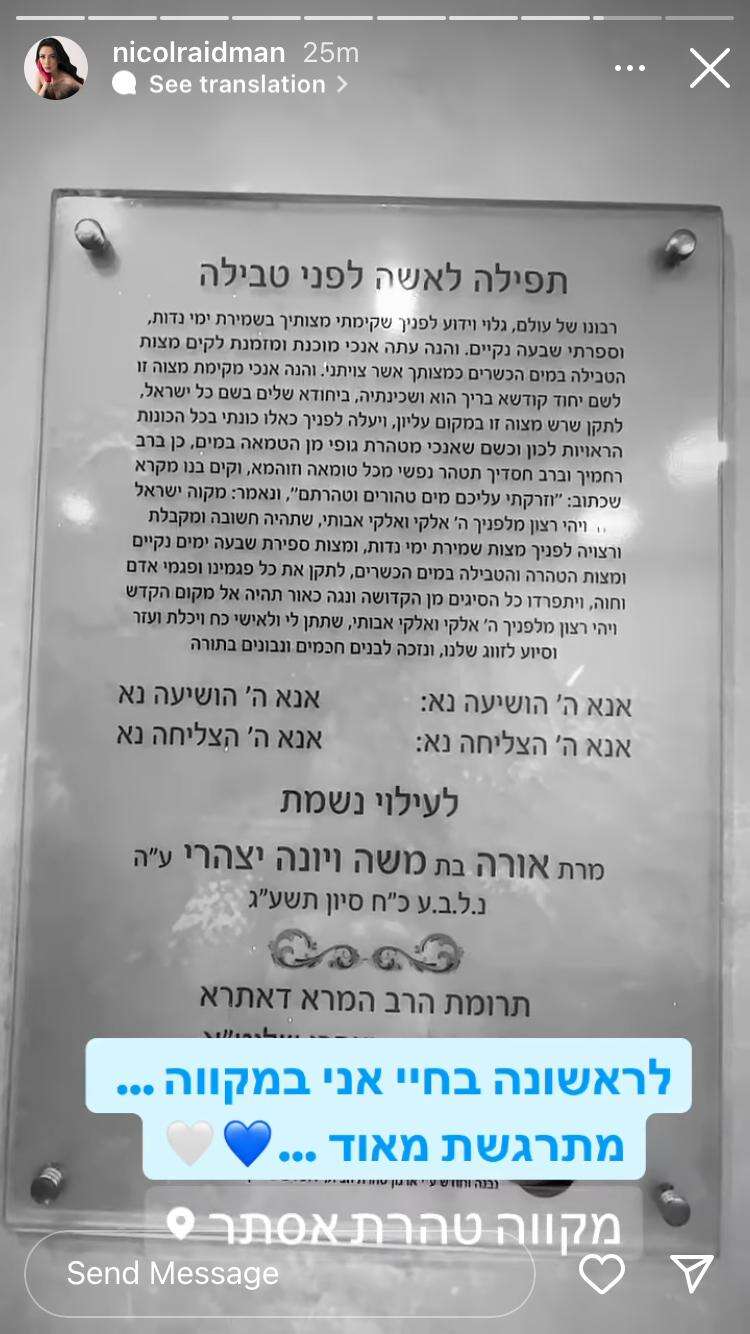 "לראשונה בחיי אני במקווה, מתרגשת מאוד", כתבה ראידמן על רקע תפילת הטבילה המונצחת על גבי קיר בית הטהרה. "ברכת האל", הוסיפה לאחר מכן בתמונה נוספת מתוך המקום. עוד קודם, כאמור, העלתה ניקול פוסט שבו חלקה מתובנותיה בכל הקשור למערכות יחסים שאין בהן אהבה. במילים חריפות, שאולי נכתבו מניסיון, היא תיארה חיים בלתי נסבלים, לצד פרטנר שלא קיימת אליו חיבה: "אל תחיו בלי אהבה.