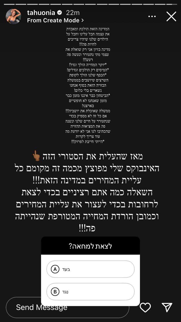 היום, כאמור, התייחסה לטקסט שנכתב: "האינבוקס שלי מפוצץ מכמה שעליית המחירים במדינה מקוממת", חלקה. "השאלה היא עד כמה אתם רציניים כדי לצאת לרחובות ולעצור את זה", שאלה והחזירה את הכדור לידיו של הציבור, בתקווה שניצני המחאה שאנו עדים להם בזמן האחרון יהפכו לגל משמעותי של מאבק שיביא לשינוי המיוחל.