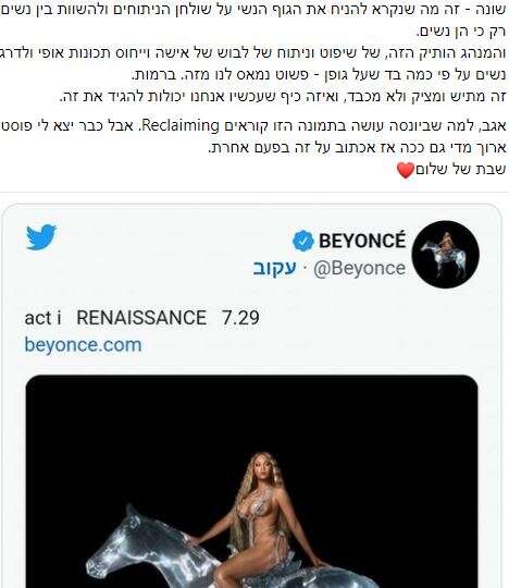 "נכתב בעקבות הביקורת הרבה על התמונה של המלכה החזקה והיפה והחכמה והלבושה לטעמה, ביונסה", הבהירה תחילה רוזנברג את הסיבה העיקרית להעלאת הפוסט המדובר בעמוד הפייסבוק שלה המונה מעל 40 אלף עוקבים. "גבר יקר, לא כל אישה שלבושה לא לטעמך מחפיצה את עצמה", ביקשה להבהיר אולי גם לשדרן הרדיו והעיתונאי יובל אברמוביץ', שיצא נגד תמונת האלבום בפוסט משלו, גם כן ברשת החברתית פייסבוק. "אם היא עשתה את זה (הצטלמה לעטיפת אלבומה בצורה חושפנית) מבחירה אישית כי ככה היא מרגישה יפה ושמחה, אז השיפוט שלך לא רלוונטי, והוא נובע אך ורק מתפיסה תרבותית שלך", פסקה.