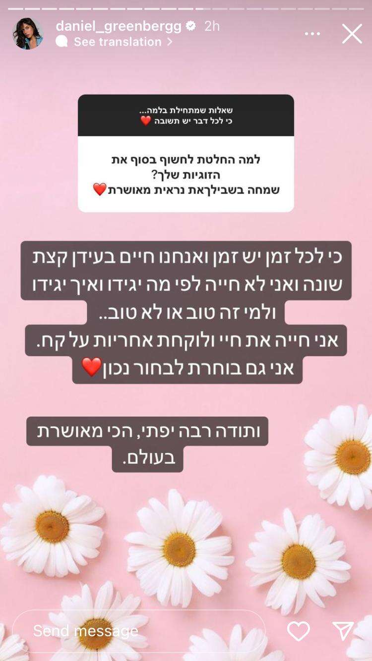 שאלה נוספת שנדרשה גרינברג להשיב עליה ביקשה את דעתה על הקלות הרבה שבה זוגות נפרדים היום, בניגוד למה שהיה מקובל בעבר. "בעקרונות ובערכים שלי אני מאוד אישה של פעם. בית, משפחה, ילדים זה מעל לכל מבחינתי", כתבה. "אנחנו חד משמעית לא חיים בעולם של פעם. מאוד קשה היום מהרבה בחינות", קבעה.