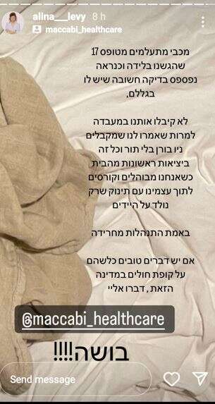 "מכבי מתעלמים מטופס 17 שהגשנו בלידה, וכנראה נפספס בדיקה חשובה שיש לו בגללם. לא קיבלו אותנו במעבדה למרות שאמרו לנו שמקבלים ניו בורן בלי תור, וכל זה ביציאות ראשונות מהבית כשאנחנו מבוהלים וקורסים לתוך עצמנו עם תינוק שרק נולד על הידיים. באמת התנהלות מחרידה", כתבה לוי.