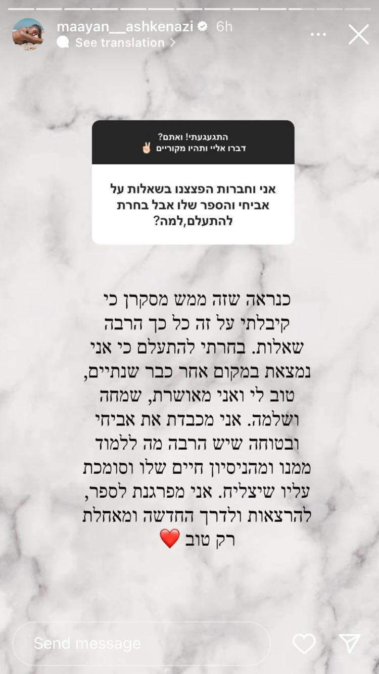 "אני וחברות הפצצנו בשאלות על אביחי והספר שלו, אבל בחרת להתעלם, למה?", התעקשו המגיבות. "כנראה שזה ממש מסקרן כי קיבלתי על זה כל כך הרבה שאלות", הודתה אשכנזי בפתח תשובתה. "בחרתי להתעלם כי אני נמצאת במקום אחר כבר שנתיים, טוב לי ואני מאושרת, שמחה ושלמה", חלקה בתחושותיה. "אני מכבדת את אביחי ובטוחה שיש הרבה מה ללמוד ממנו ומניסיון החיים שלו וסומכת עליו שיצליח", החמיאה. "אני מפרגנת לספר, להרצאות ולדרך החדשה ומאחלת רק טוב", הדגישה בסוף התשובה וצירפה אימוג'י של לב אדום.