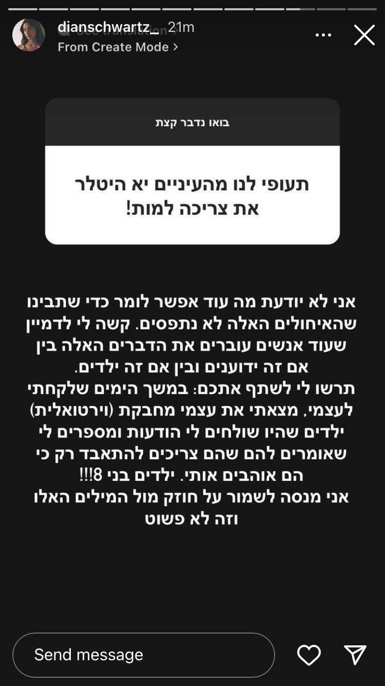 באחד מהסטוריז שהעלתה שוורץ, היא בחרה להעלות ציטוט של קללות ודברים קשים שנכתבו לה. "תעופי לנו מהעיניים, יא היטלר. את צריכה למות!", נכתב לה. "אני לא יודעת מה עוד אפשר לומר כדי שתבינו שהאיחולים הללו לא נתפסים. קשה לי לדמיין שעוד אנשים עוברים את הדברים האלה, בין אם זה ידוענים ובין אם זה ילדים. במשך הימים שלקחתי לעצמי מצאתי את עצמי מחבקת וירטואלית ילדים שהיו שולחים לי הודעות ומספרים לי שאומרים להם שהם צריכים להתאבד רק כי הם אוהבים אותי. ילדים בני שמונה! אני מנסה לשמור על חוזק מול המילים הללו, וזה לא פשוט".