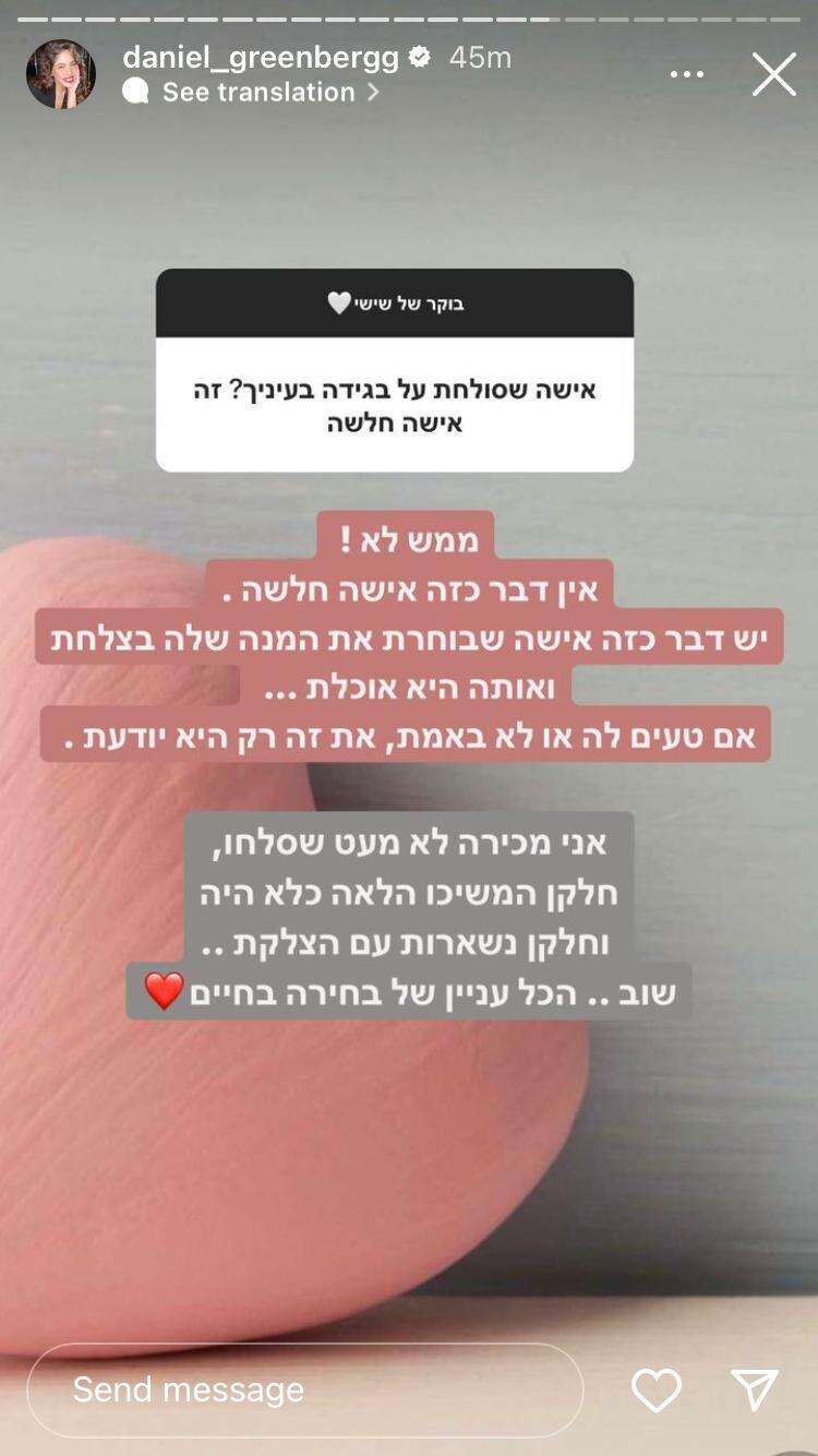 דניאל גרינברג התעוררה בבוקר שישי האחרון עם חשק לפתוח את הלב ולהשיב ל-461 אלף עוקביה ברשת החברתית אינסטגרם על שאלות שהופנו אליה בנושאים שונים ומגוונים. בין היתר, נדרשה הדוגמנית ואשתו לשעבר של אייל גולן, לחלוק בדעתה על אישה שסולחת אחרי בגידה של בעלה, ולשתף בדרך שבה היא בוחרת להתייחס לביקורת שמופנית כלפיה מצד טוקבקיסטים כשהיא מעלה תכנים לעמודה האישי, בהם היא מתועדת כשהיא רוקדת ומבלה במסיבות.