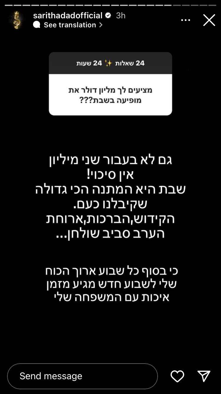 שאלה נוספת שנשלחה לשרית ביקשה לדעת האם יש סכום כסף שתמורתו תסכים להופיע בשבת (חדד כידוע לא מופיעה בשבת. בעבר ויתרה על מיליון שקלים בכדי לא להופיע בשבת במסגרת הופעות הפסטיגל). "מציעים לך מיליון דולר, את מופיעה בשבת?". "גם לא בעבור שני מיליון. אין סיכוי!", הצהירה. "שבת היה המתנה הכי גדולה שקיבלנו כעם. הקידוש, הברכות, ארוחת הערב סביב השולחן. כי בסוף כל שבוע ארוך, הכוח שלי לשבוע חדש מגיע מזמן איכות עם המשפחה שלי".