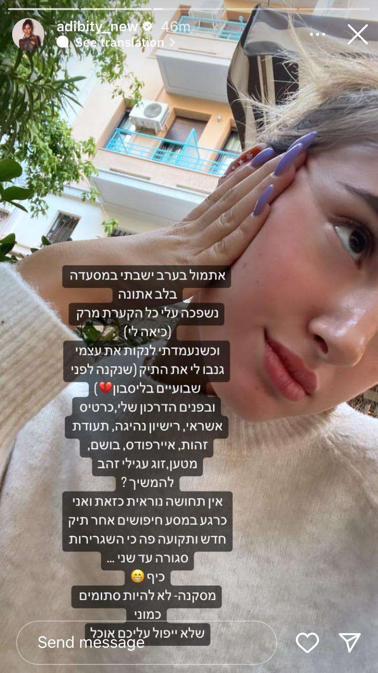 מאוחר יותר, כאמור, עדכנה ביטי במאמציה להשבת תיקה הגנוב. "טוב, אני חייבת להמשיך לשתף בעלילות התיק שאבד. קיבלתי מלא הודעות שיש דבר כזה 'מצא את האיירפוד'. יש איזה בחור חמוד שהכרתי עכשיו, שעזר לי להגיע לאפליקציה, ומצאתי את המיקום המדויק של האוזניות, הגעתי למשטרה, ולצערי מדובר בבניין של 20 דירות וכמובן שאין להם אפשרות להיכנס לכל הדירות.