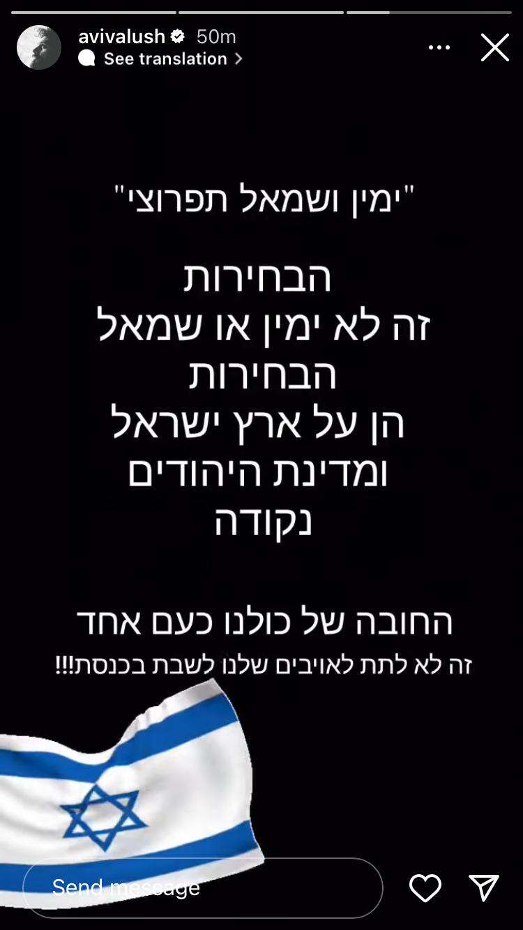 "הבחירות הן לא ימין או שמאל. הבחירות הן על ארץ ישראל ומדינת היהודים. נקודה. החובה של כולנו, כעם אחד, היא לא לתת לאויבים שלנו לשבת בכנסת!", הסביר השחקן אביב אלוש כיצד הוא רואה את הדברים.