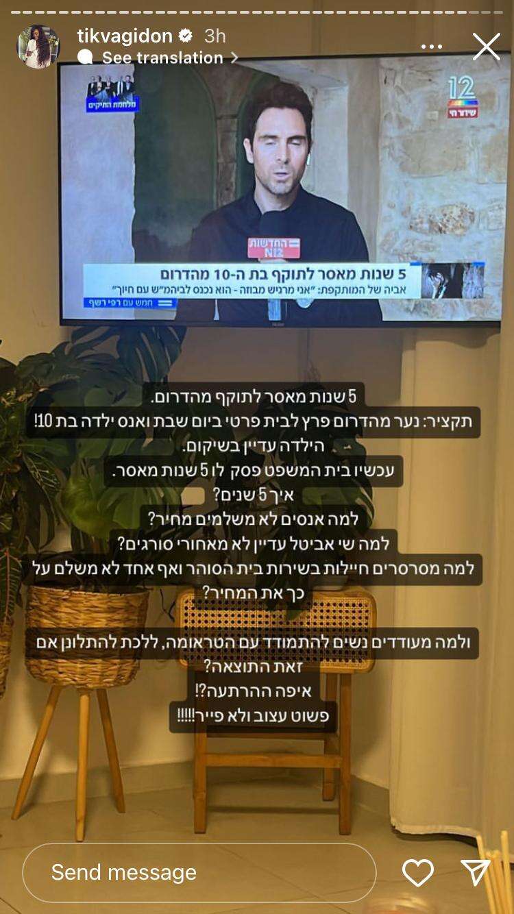 "5 שנות מאסר לתוקף מהדרום", הזדעזעה זוכת "האח הגדול" תקוה גדעון. "תקציר: נער מהדרום פרץ לבית פרטי ביום שבת ואנס ילדה בת 10! הילדה עדיין בשיקום. עכשיו בית המשפט פסק לו 5 שנות מאסר. איך 5 שנים? למה אנשים לא משלמים מחיר? למה מעודדים נשים להתמודד עם הטראומה, ללכת להתלונן, אם זאת התוצאה? איפה ההתרעה?!", תהתה.