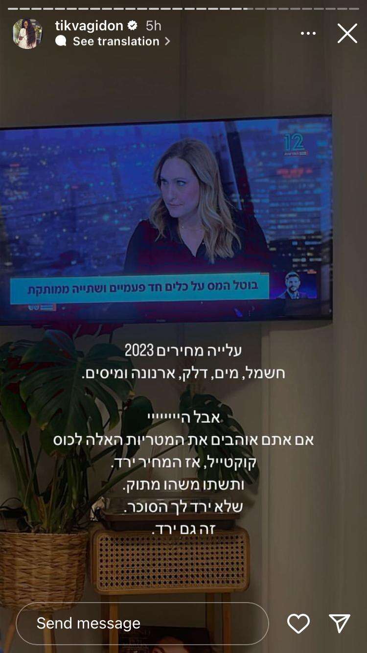 כאמור, גם תקוה גדעון הצטרפה לביקורת על ההחלטה. "עליית מחירים 2023: חשמל, דלק, ארנונה מיסים", מנתה. "אבל היי, אם אתם אוהבים את המטריות האלה לכוס קוקטייל, אז המחיר ירד. ותשתו משהו מתוק, שלא ירד לכם הסוכר", עקצה.