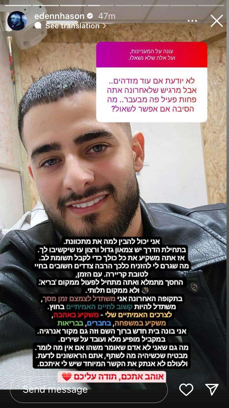 "לא יודעת אם עוד מזהים, אבל מרגיש שלאחרונה אתה פחות פעיל פה מבעבר. מה הסיבה, אם אפשר לשאול?", הסתקרנה אחת העוקבות של חסון. "אני יכול להבין למה את מתכוונת. בתחילת הדרך יש צימאון גדול ורצון עז שיקשיבו לך, אז אתה משקיע את כל כולך כדי לקבל תשומת לב - מה שגרם לי להזניח כל כך הרבה צדדים חשובים בחיי לטובת הקריירה", שיתף.