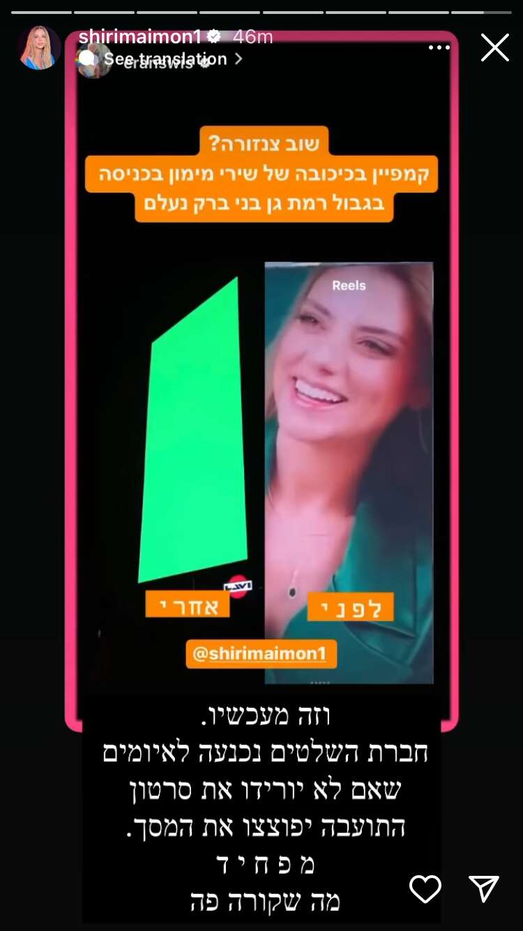 כבר אתמול בשעות הערב התייחסה מימון לידיעה על הסרת השלט המדובר, שהובאה בעמוד האינסטגרם של כתב "ישראל היום" ערן סויסה. "וזה מעכשיו", עדכנה בסטורי את 318 אלף עוקביה באינסטגרם על רקע תמונה של הפרסומת בהשתתפותה לפני ולאחר הסרתה, שהוחלפה ברקע ירוק.