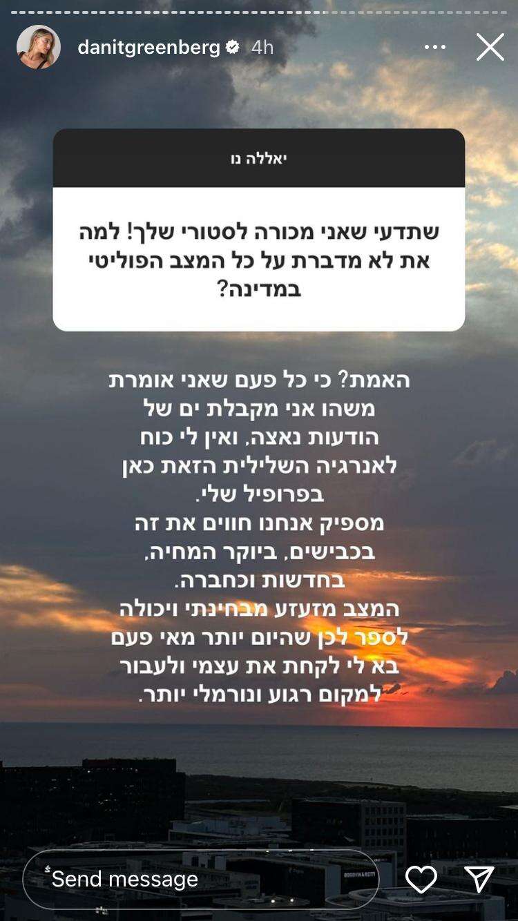 "שתדעי שאני מכורה לסטורי שלך!", החמיאה אחת העוקבות לגרינברג בפתח השאלה , שאחריה הגיעה השאלה המאתגרת. "למה את לא מדברת על כל המצב הפוליטי במדינה?", תהתה. "האמת? כי כל פעם שאני אומרת משהו, אני מקבלת ים של הודעות נאצה", הסבירה דנית.