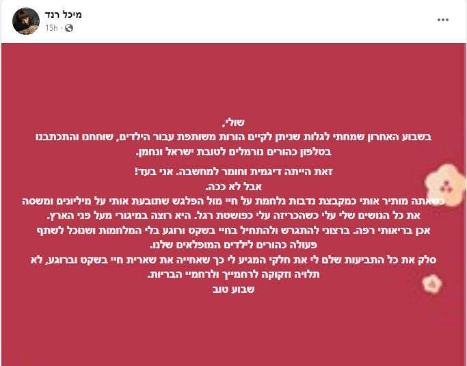 מיכל רנד, שמשתפת בעקביות את חבריה בפייסבוק בדרמות המשפחתיות ובהתנהלותה מול בעלה לשעבר, הזמר שולי רנד, פרסמה אמש (שבת) פוסט מפתיע במיוחד.
