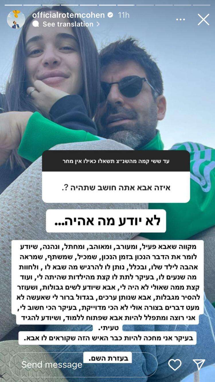 השאלה הבאה שעליה נדרש להשיב עסקה בעתיד הקרוב, שבו יהפוך להורה. "איזה אבא אתה חושב שתהיה?", אתגרו אותו העוקבים. "לא יודע מה אהיה", התקשה כהן להחליט תחילה. "מקווה שאבא פעיל ומעורב, מאוהב ומחנך, ונהנה, שיודע לומר את הדבר הנכון בזמן הנכון, שמכיל, שמשתף, שמראה אהבה לילד שלו, ובכלל- נותן לו להרגיש מה שבא לו ולחוות מה שנעים לו", פירט.