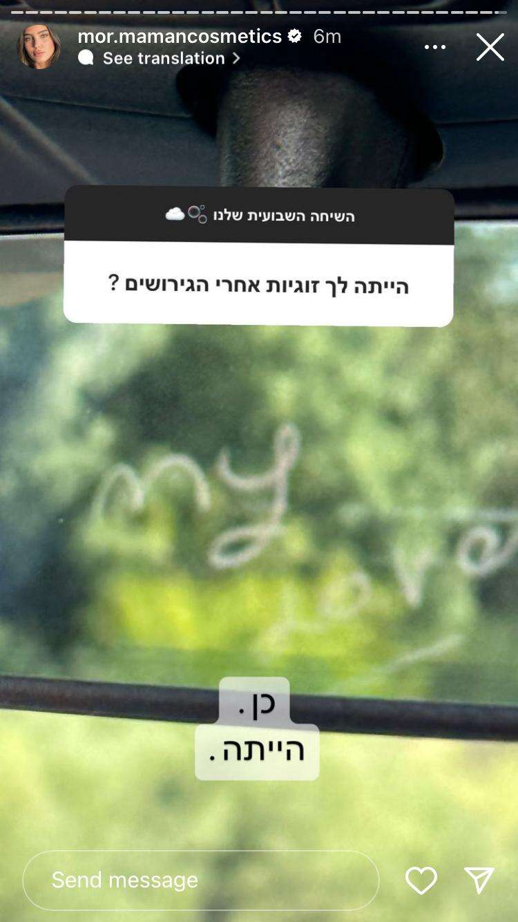 כשנה חלפה מאז מור ממן התגרשה מבעלה ואבי ילדיה, והיא כבר הספיקה להיות בזוגיות, כך היא חשפה אמש (שלישי) בסשן שאלות ותשובות שקיימה עם 158 אלף עוקביה באינסטגרם.