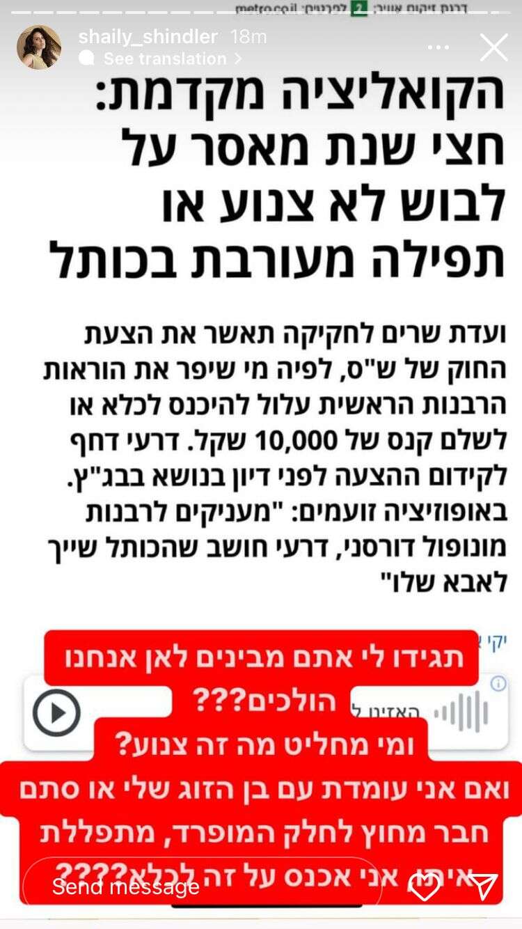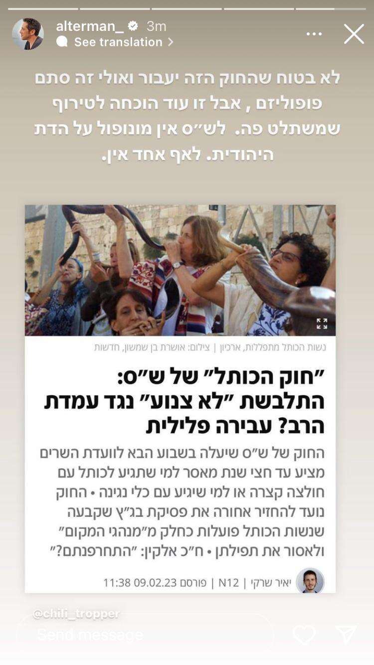 "כל כך הרבה שאלות. למה? למה להרחיק יהודים מהמקום שקדוש לנו?", כאבה שדרנית הספורט רותם ישראל. "למה להחריף את הפילוג בין חילונים לדתיים? האם זה החוק שהכי בוער עכשיו להניח על שולחן הכנסת? מה עם הבעיות האמתיות שדורשות כאן טיפול? מי שמכבד את המקום הקדוש הזה, מתלבש בהתאם גם בלי שיאיימו עליו באישום פלילי. ואיסור שירה בכותל. באמת?", התקשתה להבין. מגישת הטלוויזיה רותם סלע לא אמרה הרבה, אבל הפנתה בסטורי שלה לפוסט של חבר הכנסת חילי טרופר, שטען בין היתר כי הממשלה הנוכחית עושה הכל כדי לפלג בין יהודים.