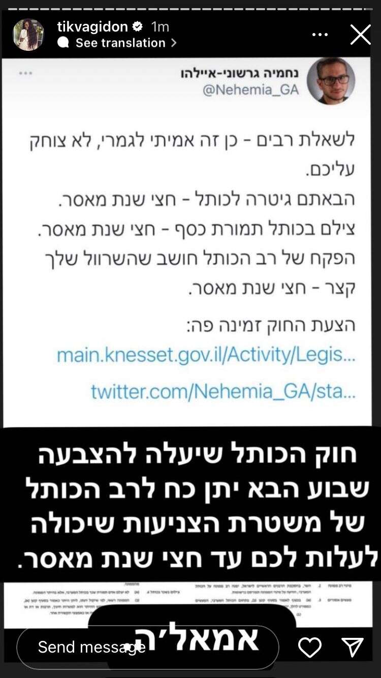 "חוק הכותל שיעלה להצבעה בשבוע הבא ייתן כוח לרב הכותל של משטרת הצניעות שיכולה לעלות לכם עד חצי שנת מאסר. אימאל'ה", הביעה זעזוע זוכת "האח הגדול תקוה גדעון. "ואני שואלת איפה הצעות החוק שיגנו על האזרחים, שיגנו על נשים! למרות שאין לנו ייצוג בכנסת. זאת האמונה שלי לא פחות משלהם. אני גדלתי על ערכים של דת. אני באה מבית מסורתי. עד היום כשאני מגיעה למשפחה שלי אני מכבדת ומתלבשת בהתאם, כנ"ל לגבי הכותל. עד היום חיינו בשלום ובכבוד בלי החוק הזה. למה הכפייה הזאת תורמת חוץ מפילוג? תעצמו עיניים כמה שאתם רוצים, בקצב הזה אנחנו בדרך לדיקטטורה", טענה גדעון. "ואם נמשיך להתבונן מהצד, זה לא יקרה עוד הרבה זמן", הזהירה.
