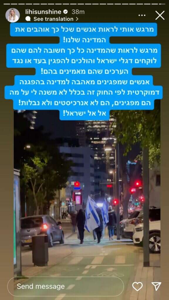"מרגש אותי לראות אנשים שכל כך אוהבים את המדינה שלנו!", כתבה גרינר בסטורי על רקע צילום מתוך ההפגנה שנערכה אמש בתל אביב. "מרגש לראות שהמדינה כל כך חשובה להם, שהם לוקחים את דגלי ישראל והולכים להפגין בעד או נגד הערכים שהם מאמינים בהם!", הסבירה ל-214 אלף עוקביה באינסטגרם. "אנשים שמפגינים מאהבה למדינה, בהפגנה דמוקרטית, לפי חוק, זה בכלל לא משנה לי על מה הם מפגינים", שיתפה בדעתה על המוחים נגד הרפורמה המשפטית של שר המשפטים לוין.