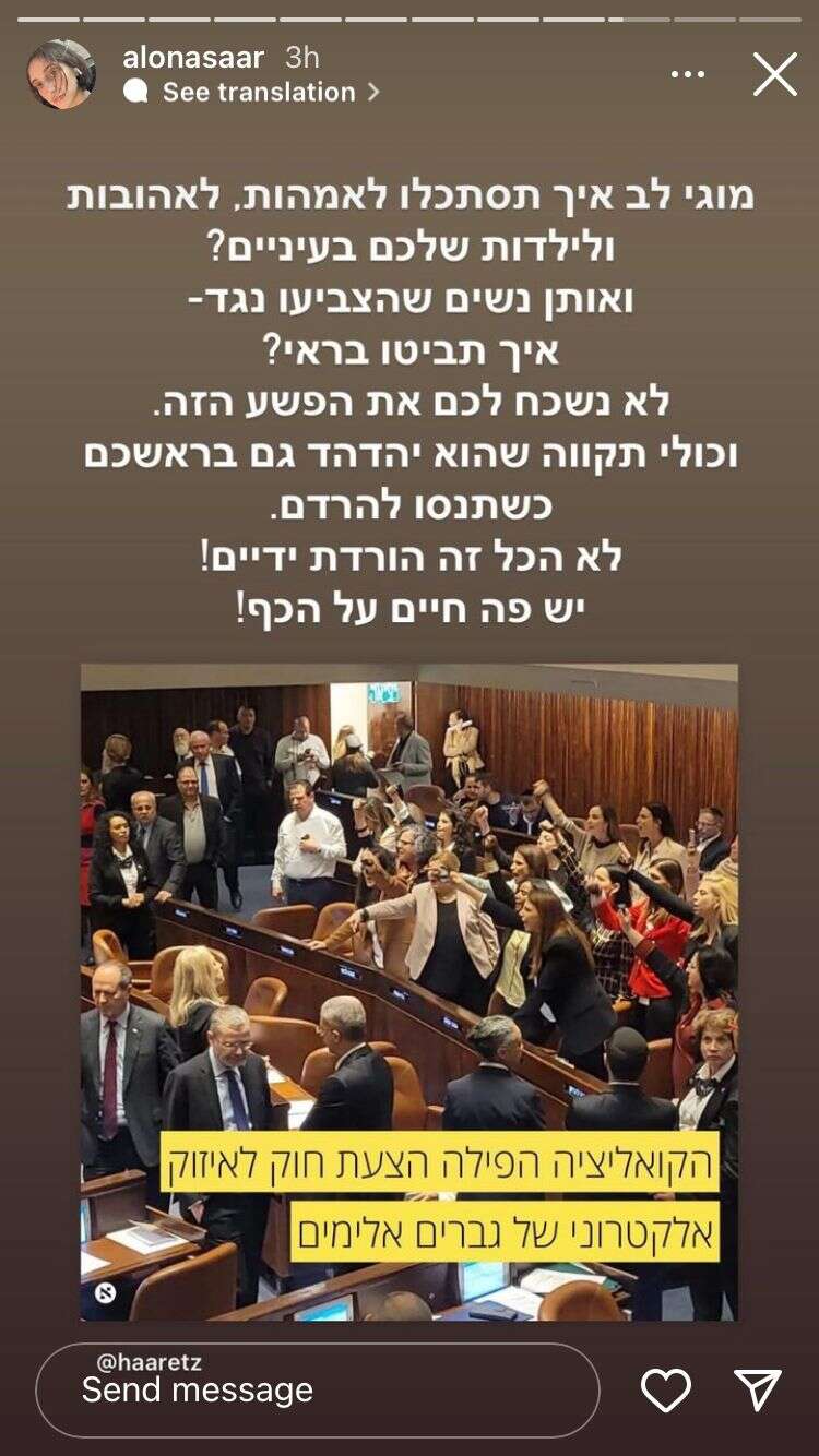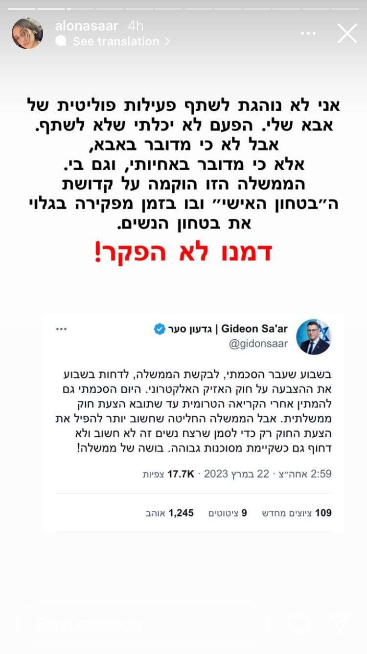 סער הבת לא הסתפקה רק בדברים הללו, והעלתה לאחר מכן סטורי נוסף, עם מילים תקיפות יותר נגד הממשלה. "מוגי לב, איך תסתכלו לאימהות, לאהובות ולילדות שלכם בעיניים?", שאלה. "אותן נשים שהצביעו נגד, איך תביטו בראי?", תהתה. "לא נשכח לכם את הפשע הזה", הבטיחה. "כולי תקווה שהוא יהדהד בראשכם כשתנסו להירדם. לא הכל זה הורדת ידיים!", רמזה ליחסי הכוחות בין הקואליציה לאופוזיציה. "יש פה חיים על הכף!", הוסיפה לבסוף בכעס.