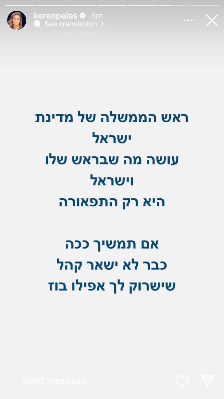 "המלך ביבי הקשיב לנסיך יאיר, ואיבד את המדינה שלו. טרגדיה שייקספירית 2023", תיארה בעוקצנות את המציאות השחקנית אגם רודברג. "ראש הממשלה של מדינת ישראל עושה מה שבראש שלו, וישראל היא רק תפאורה. אם תמשיך ככה, כבר לא יישאר קהל שישרוק לך אפילו בוז", התריעה קרן פלס.