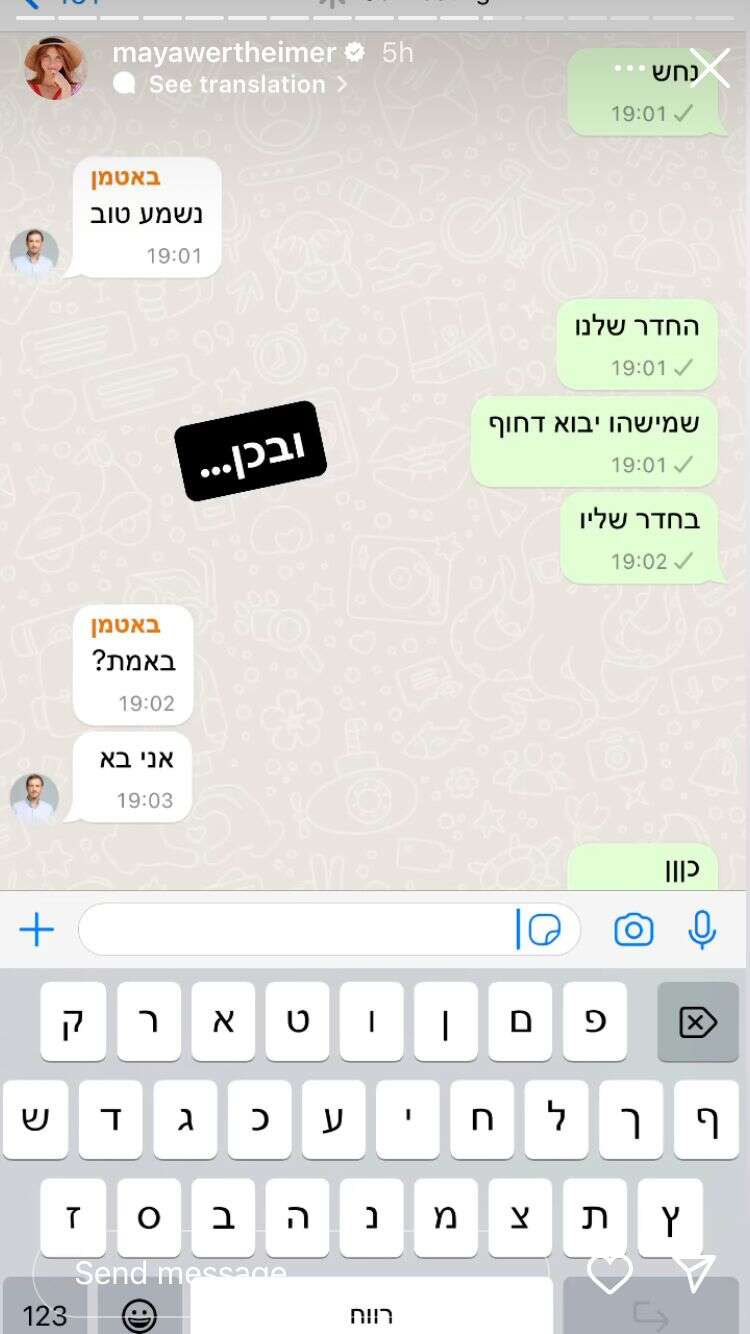 "אז איך עבר היום?", כתבה ורטהיימר על רקע תמונה מדברית מתוך החופשה, ומיד לאחר מכן שיתפה בצילום מסך של שיחה כתובה בינה לבין בעלה, אסף זמיר. "נחש", כתבה ורטהיימר לזמיר בקצרה. "נשמע טוב", הגיב לה בהומור, כמי שמסרב להאמין. "בחדר שלנו", המשיכה מאיה. "שמישהו יבוא דחוף", ביקשה. "באמת?", שאל, "אני בא", עדכן.