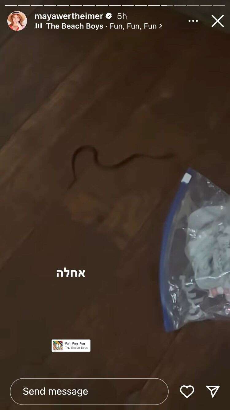 בהמשך תיעדה מאיה את הנחש על רצפת חדרה וכתבה בסרקזם קומי "אחלה". לאחר מכן הוסיפה תמונה של זמיר מתוך החופשה וכתבה בבדיחות "מזל שהגבר שלי הציל את המצב".