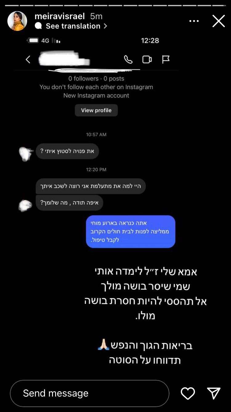 מירב ישראל, פליטת "האח הגדול", מפרסמת היום (חמישי) שיחה מטרידה שניהלה עם גולש ששלח לה הודעות מיניות בוטות באופן פרטי בחשבון האינסטגרם שלה.
