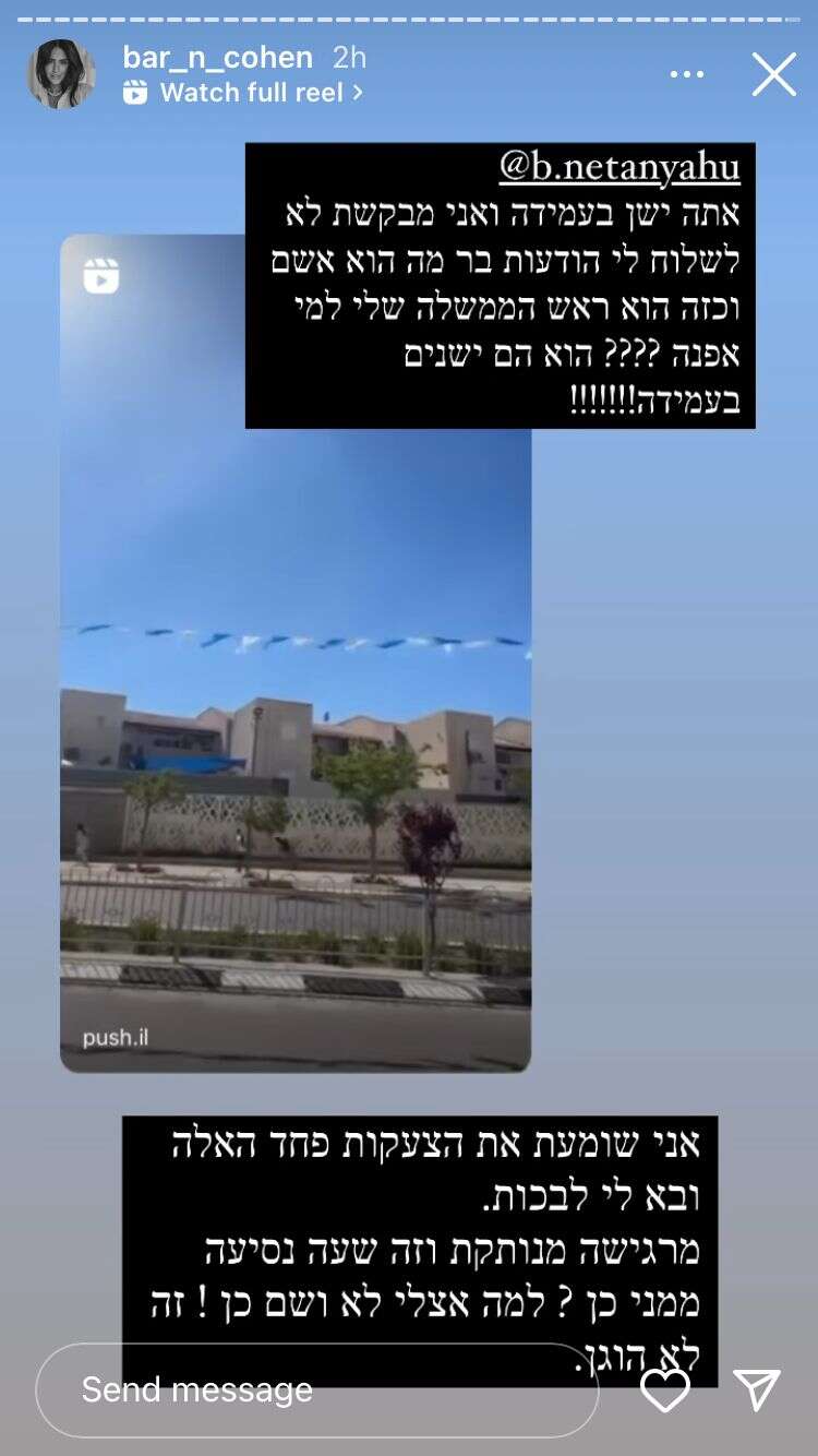 "בנימין נתניהו, אתה ישן בעמידה?", שאלה בר כהן "מהאח הגדול" בכעס את ראש הממשלה. "אני שומעת את הצעקות, ובא לי לבכות. מרגישה מנותקת וזה שעה נסיעה ממני, כן? למה אצלי לא ושם כן? זה לא הוגן", כאבה.