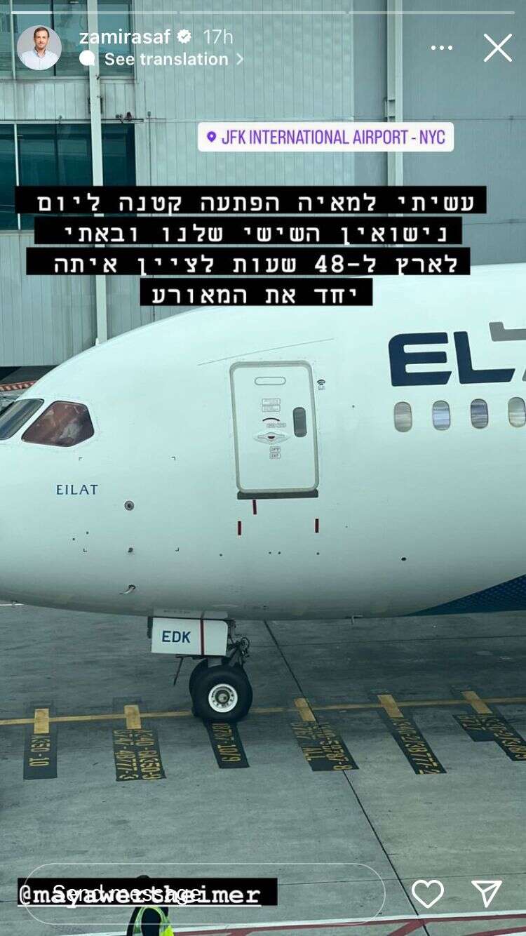 ורטהיימר כתבה את הדברים עוד לפני שידעה על ההפתעה שתכנן עבורה בעלה. "עשיתי למאיה הפתעה קטנה ליום הנישואים השישי שלנו, ובאתי לארץ ל-48 שעות לציין איתה יחד את המאורע", כתב זמיר בסטורי שפרסם בחשבון האינסטגרם שלו, שם יש לו 80 אלף עוקבים, על רק תמונת מטוס בנמל התעופה בניו יורק. "שרק אפתיע אותך כל החיים", הוסיף הקונסול לשעבר על רקע סרטון מהמפגש של השניים, שבו הם מתועדים מתנשקים ומתחבקים ארוכות, תוך שוורטהיימר מתקשה להסתיר את ההתרגשות הגדולה מהמפגש המפתיע.