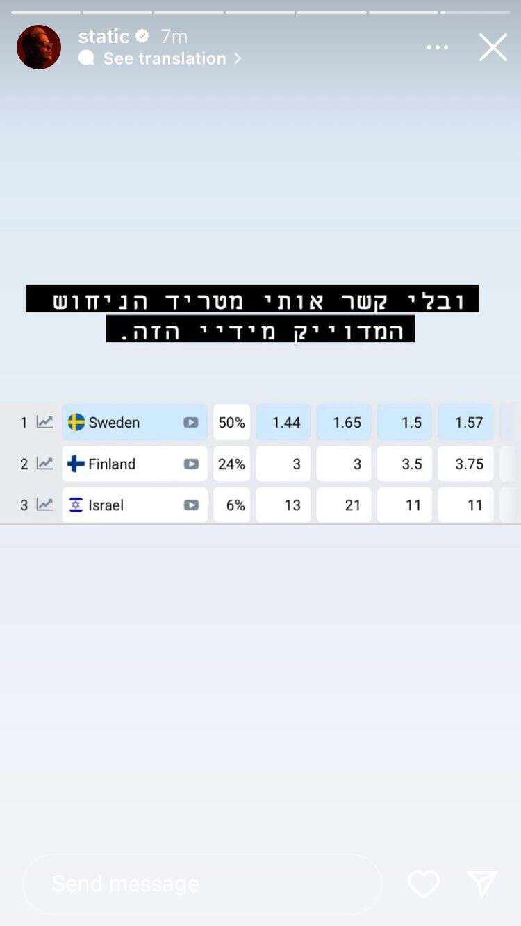 "חייבת להגיד רגע משהו. כולם אנטישמים. נועה הייתה מעלפת, סתם שורף להם מקנאה. תחזרי אלינו, מלכה. בזכותך עשו הפסקת אש. אני אישית שמה נ' בקלפי", הכריזה כוכבת "אהבה חדשה" דנה בן-ארי. "מוגש כשירות לציבור. הנה המדינות שלא הצביעו לנו", כתבה ירדן ויזל והציעה את הרשימה השחורה מבחינתה. את רצף התגובות נחתום עם בן זוגה של נועה תומר הכהן, שכתב על רקע תמונה של השניים נושקים אחד לשנייה: "כל כך גאה בך. כל כך הרבה כבוד למדינה כל כך קטנה".