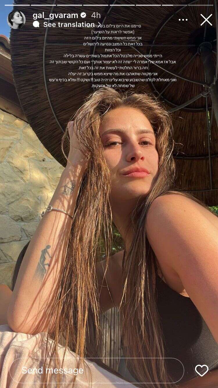 לאחר שתיעדה בסדרת סרטונים את המלון שבו הוקם סט הצילומים, וגם פרגנה למאות אלפי הגולשים שלה בתמונות מתוכו, גברעם ביקשה לסכם את היום שעבר עליה. "סיימנו את יום הצילום בשעה טובה (אפשר לראות על השיער)", כתבה גל על רקע תמונת סלפי שלה. "אני ממש חששתי מיום הצילום הזה. בכל זאת, כל המצב והנסיעה לירושלים וכל הצוות", הסבירה את המורכבות מבחינתה.